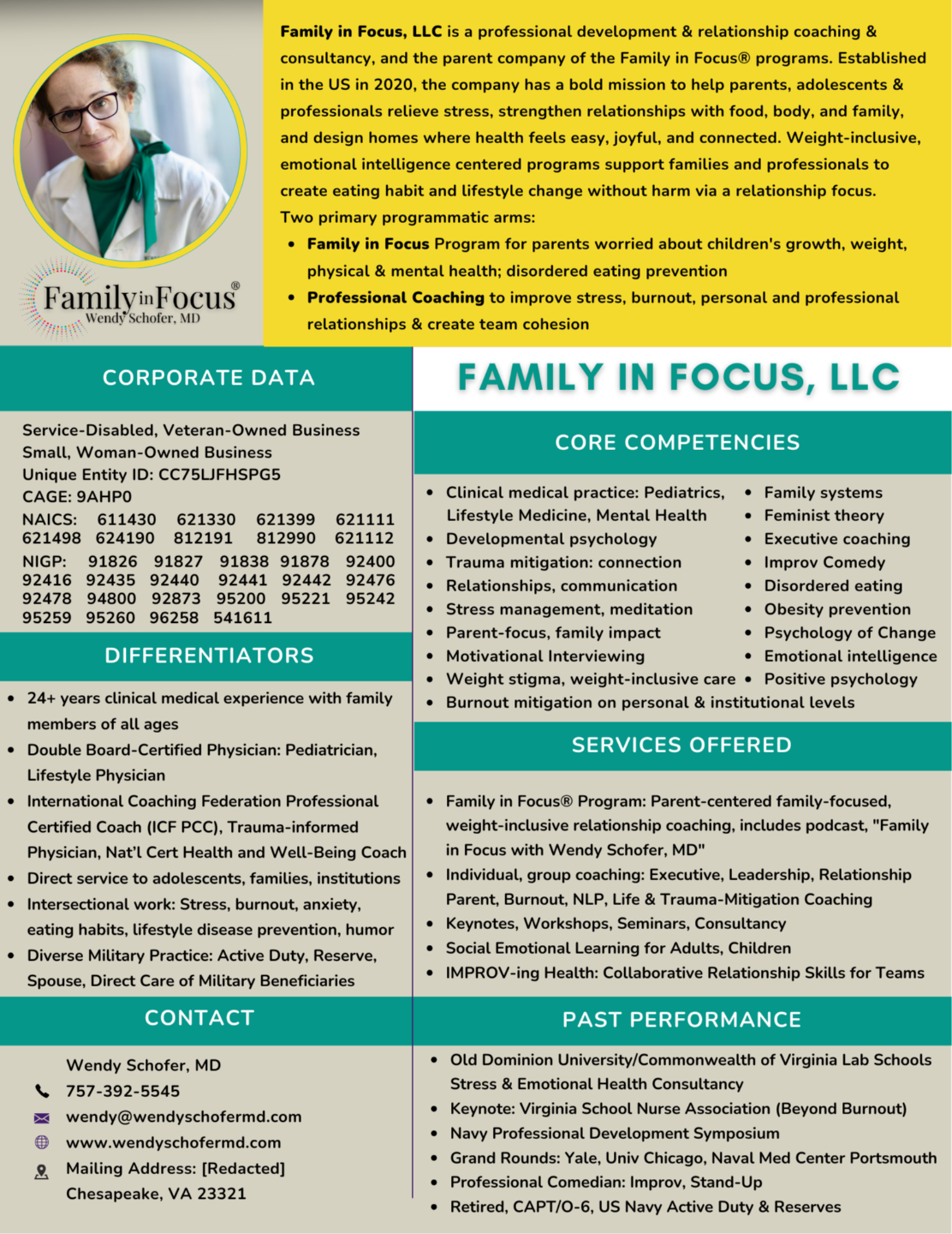 Family in Focus, LLC - the parent company of all Family in Focus® programs, outreach and advocacy by Wendy Schofer, MD - is ready to do business with federal, state and local governments, non-profits, healthcare entities, educational institutions and organizations.